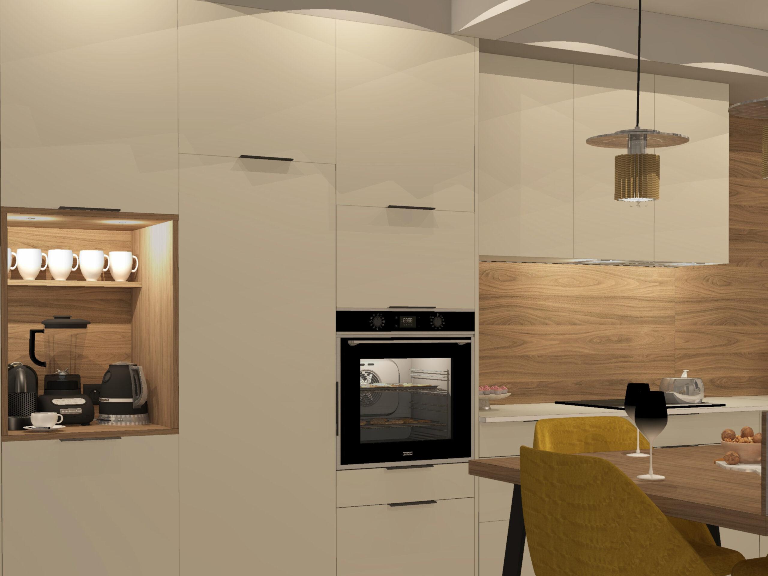Une niche vient s’intégrer dans une colonne, elle sera dédiée à la machine à café, la bouilloire, un espace petit déjeuner. Cette solution optimise l'espace tout en offrant un aspect ordonné et épuré.