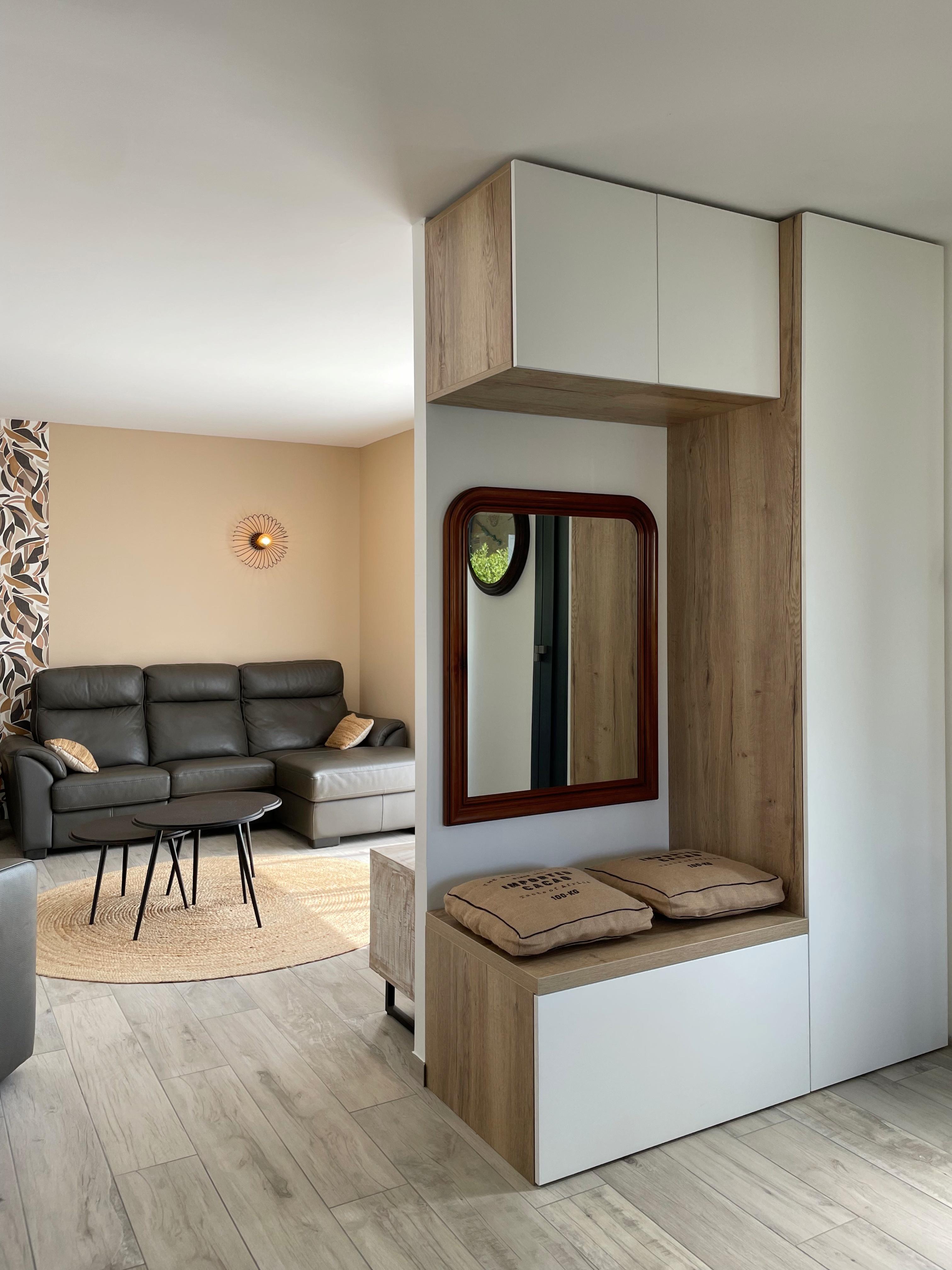 Pour la pièce de vie, des tonalités naturelles douces sont rehaussées par un papier peint feuillage dans le salon, apportant une touche de fraîcheur et de nature. L’entrée est astucieusement délimitée par un agencement qui crée une séparation visuelle avec le salon. Un rangement astucieux pour se déchausser à l’entrée, poser son manteau, son sac à mains.