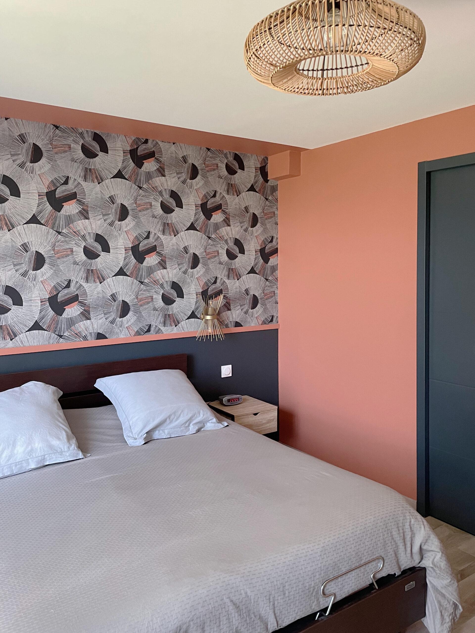 Pour la deuxième chambre : thème bleu avec un papier peint texturé en tête de lit pour ajouter de la matière.