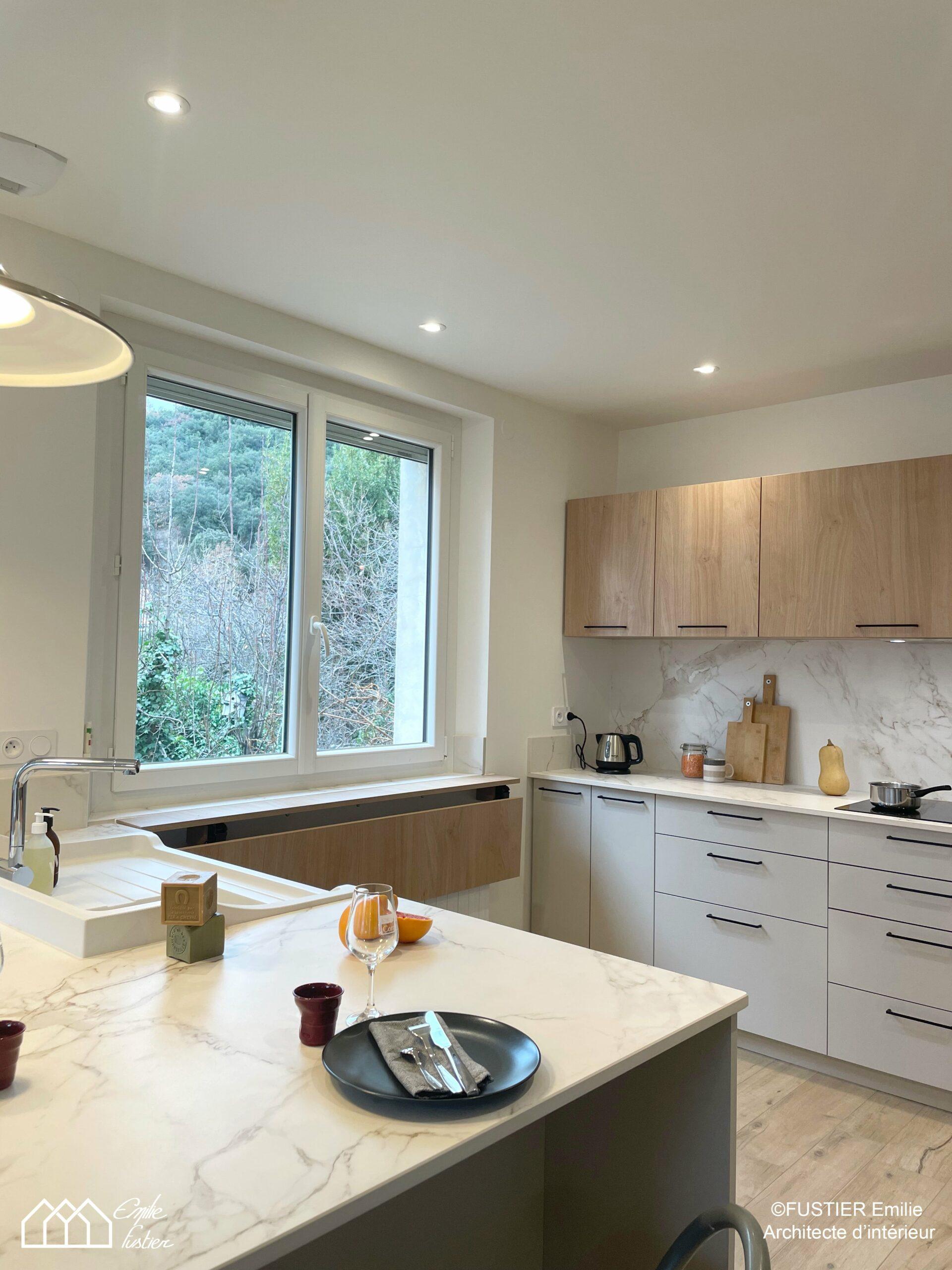 Cette maison rénovée sur Cornas en Ardèche est désormais moderne avec de beaux matériaux ; du bois, marbre, métal, tout en préservant le caractère de la maison. C’est ici une mission d’architecture d’intérieur qui été nécessaire pour la transformation de ce bien. Le décloisonnement des espaces permet actuellement d'avoir un intérieur lumineux. Depuis l'espace évier vue sur le Château de Crussol et depuis l'espace plan de travail vue sur les vignes de Cornas.