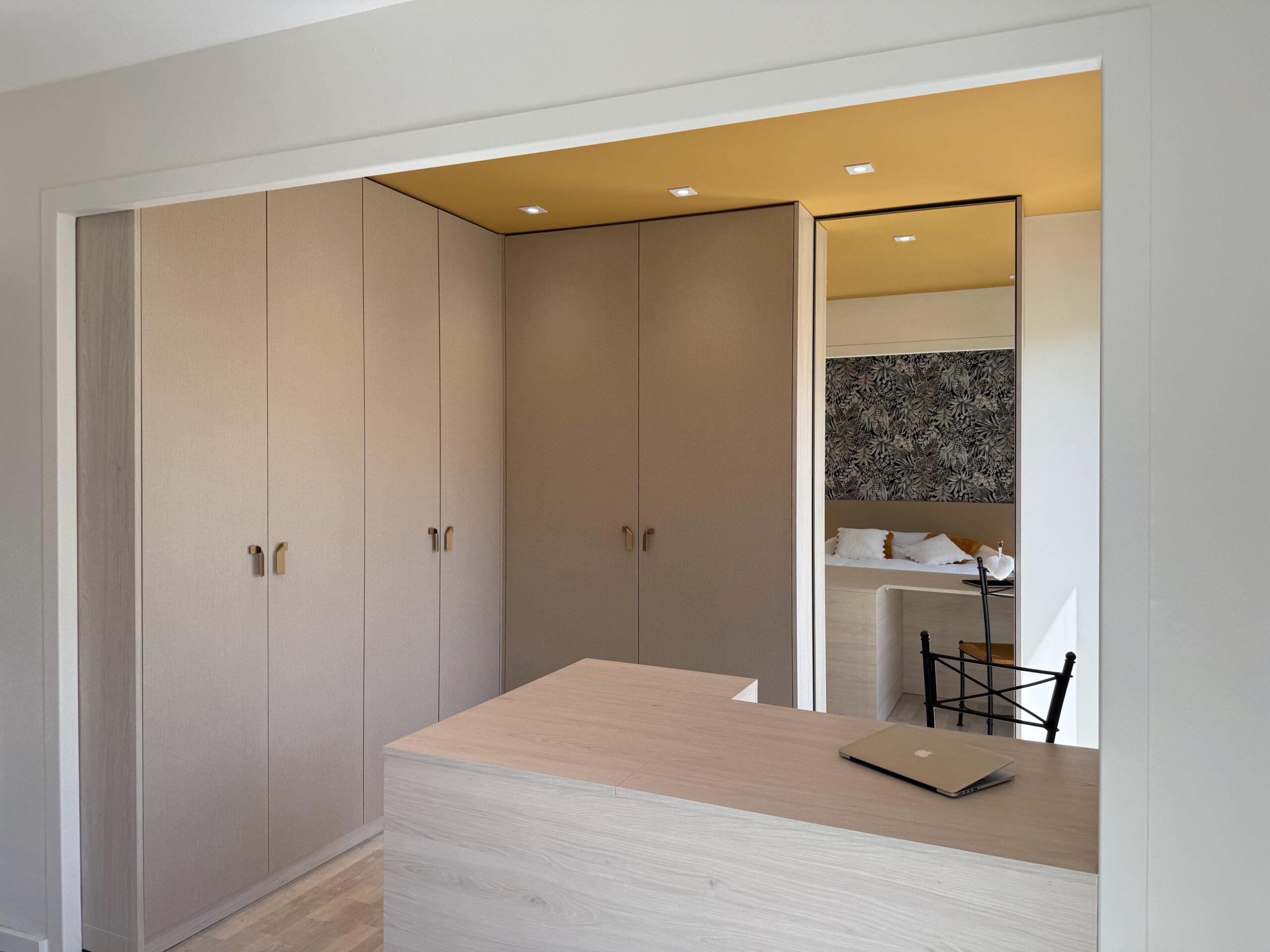 L’agencement a été entièrement pensé, dessiné réalisé sur mesure par mes soins, dans une harmonie de teintes beiges et taupe, choisies pour s’accorder parfaitement au parquet stratifié existant. Cette palette neutre et naturelle renforce la sensation de calme et de continuité dans toute la pièce.